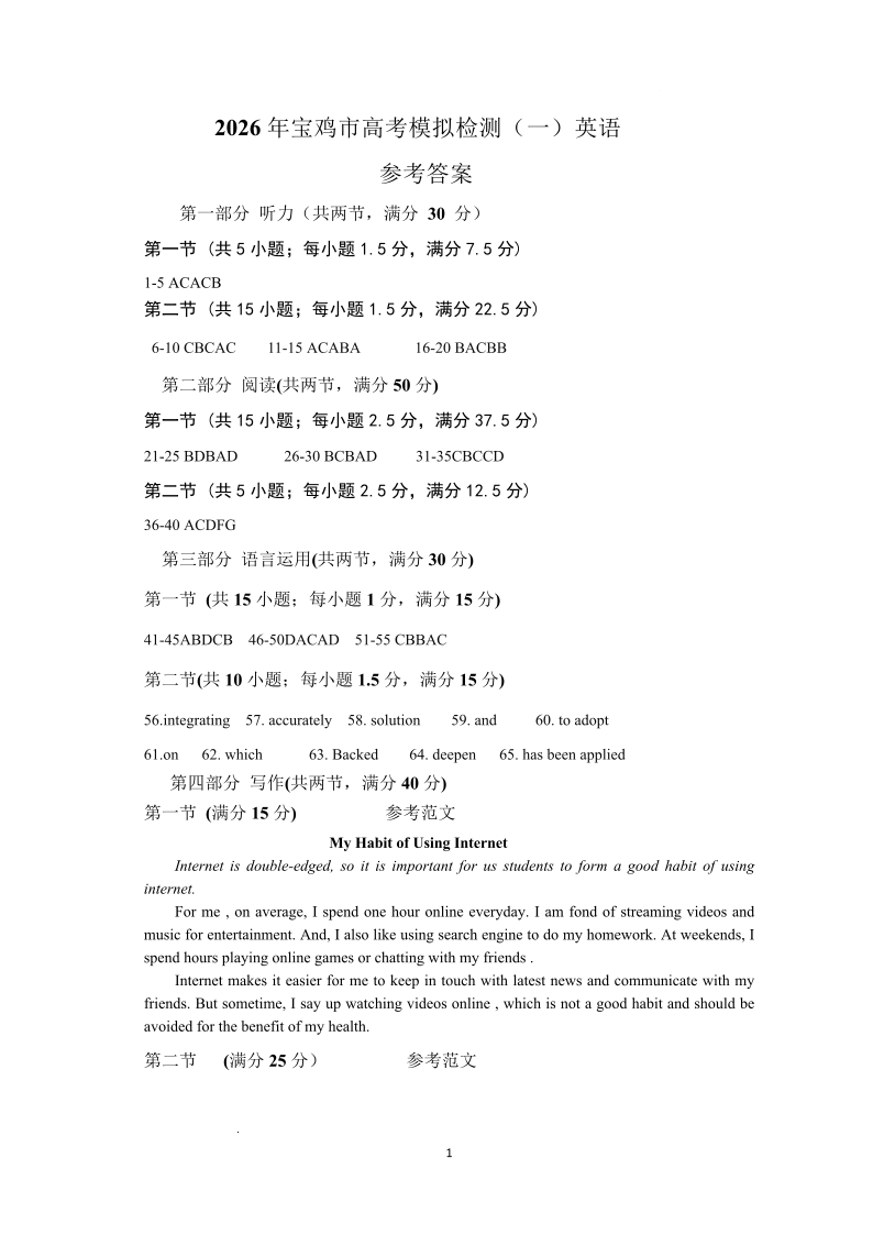 2026年宝鸡市高考模拟检测试题(一)英语答案.pdf
