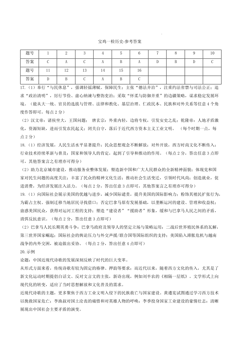 2026年宝鸡市高考模拟检测试题(一)历史答案.pdf