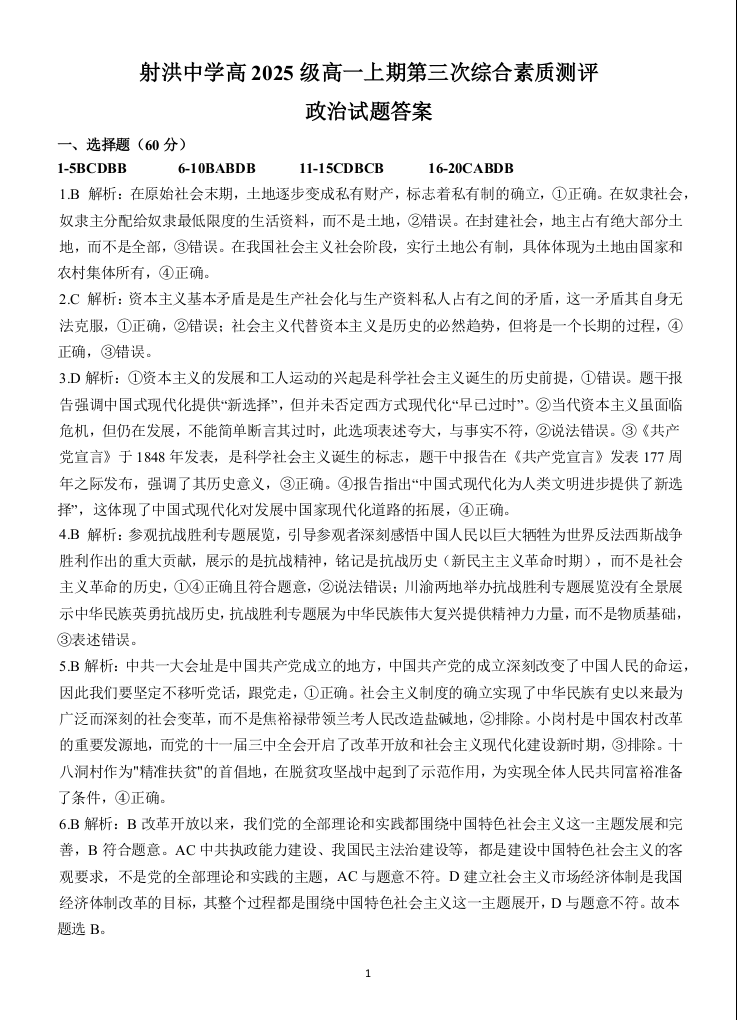 四川省遂宁市射洪中学2025-2026学年高一上学期1月月考 政治答案.docx