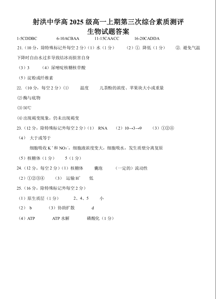四川省遂宁市射洪中学2025-2026学年高一上学期1月月考 生物答案.docx