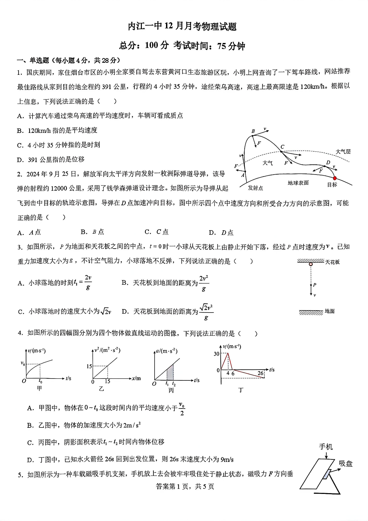 四川省内江市第一中学2025-2026学年高一上学期12月月考 物理试题(含答案).pdf