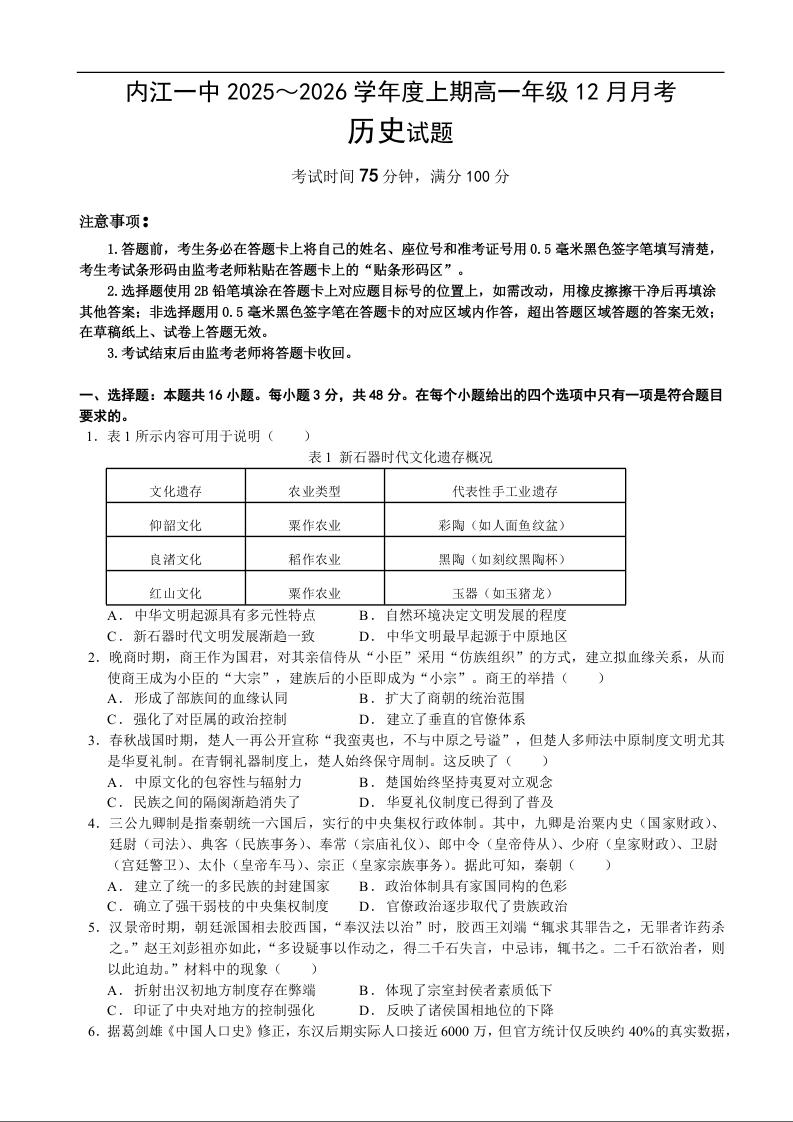 四川省内江市第一中学2025-2026学年高一上学期12月月考 历史试题(含答案).docx