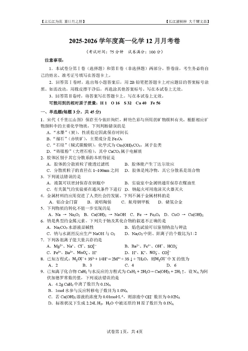 四川省内江市第一中学2025-2026学年高一上学期12月月考 化学试题(含答案).pdf