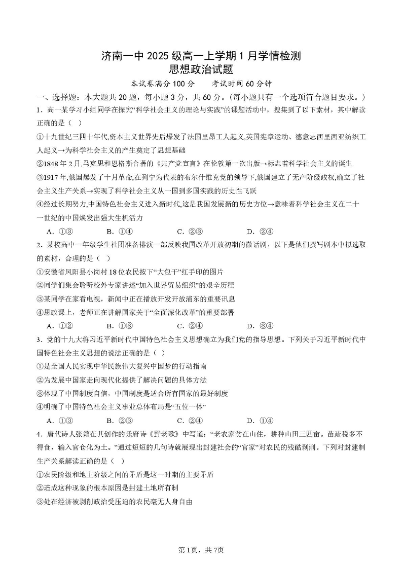 山东省济南一中2025级高一上学期1月学情检测 政治试题(含答案).pdf