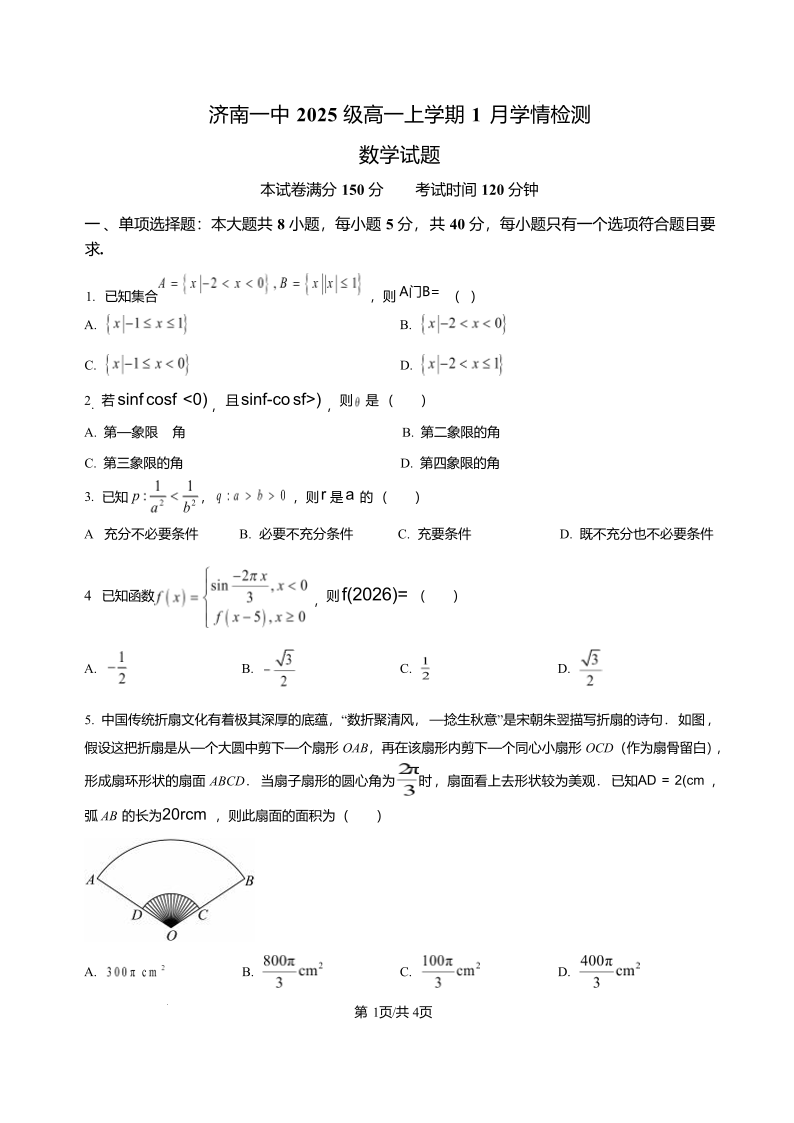 山东省济南一中2025级高一上学期1月学情检测 数学试题(含答案).pdf
