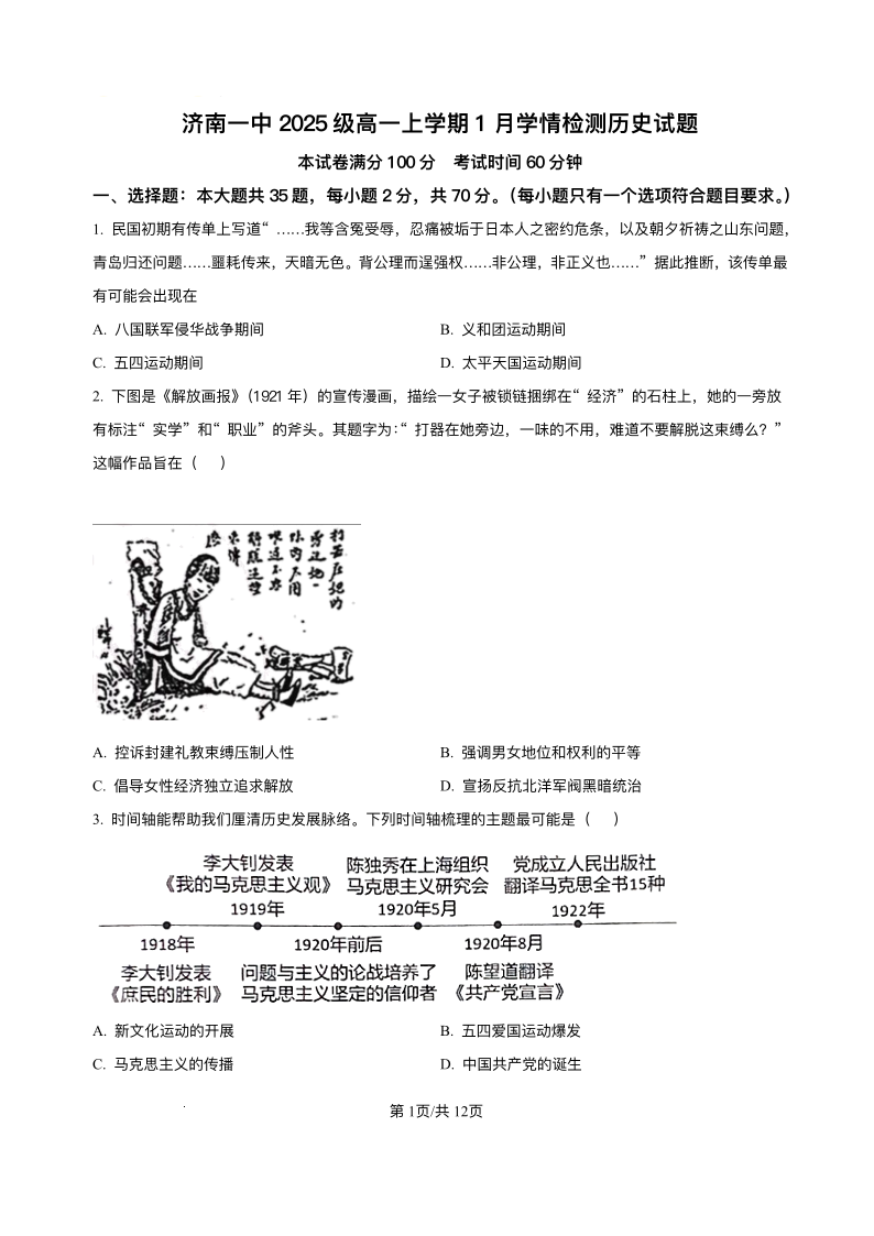 山东省济南一中2025级高一上学期1月学情检测 历史试题(含答案).pdf