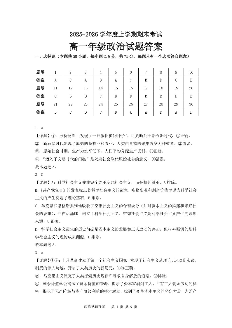 黑龙江省大庆市大庆中学2025-2026学年高一上学期1月期末考试 政治答案.pdf