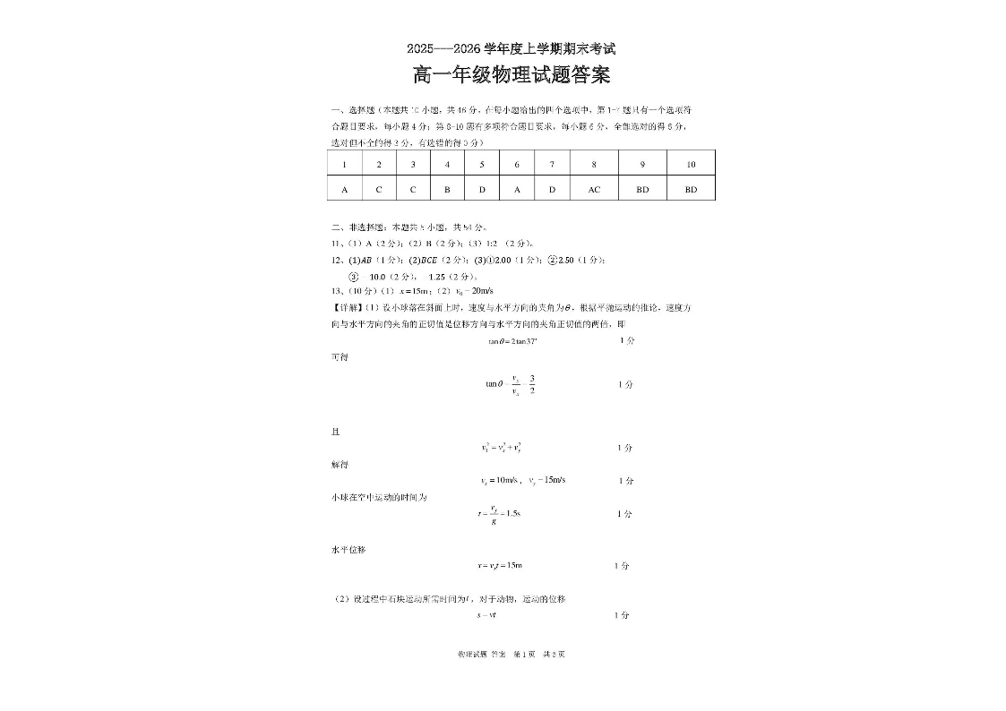 黑龙江省大庆市大庆中学2025-2026学年高一上学期1月期末考试 物理答案.pdf