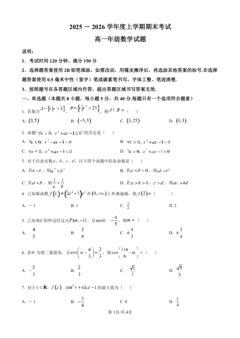 黑龙江省大庆市大庆中学2025-2026学年高一上学期1月期末考试 数学.docx