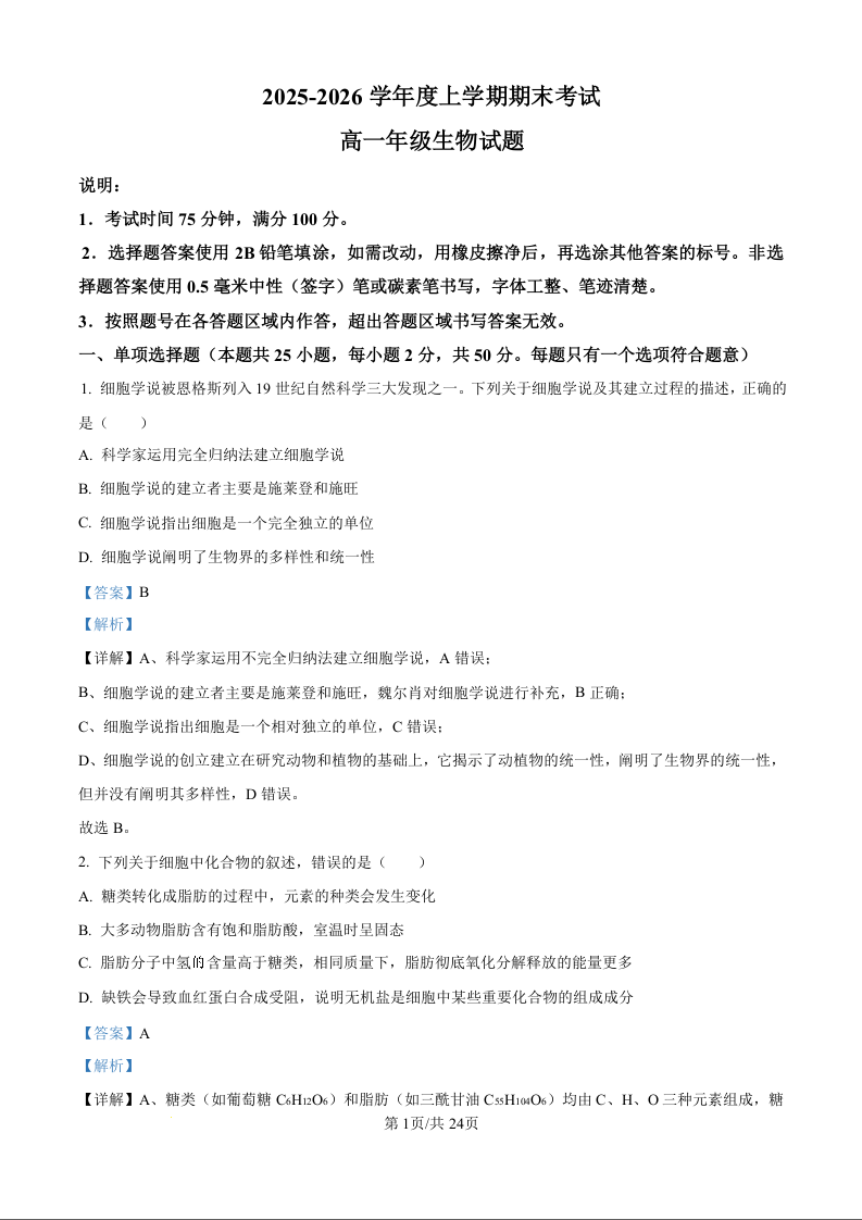 黑龙江省大庆市大庆中学2025-2026学年高一上学期1月期末考试 生物答案.docx