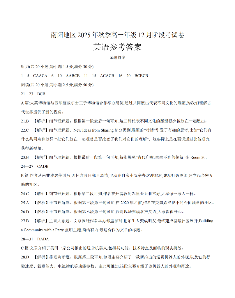 河南省南阳地区2025-2026学年高一上学期12月阶段考试卷 英语答案.pdf
