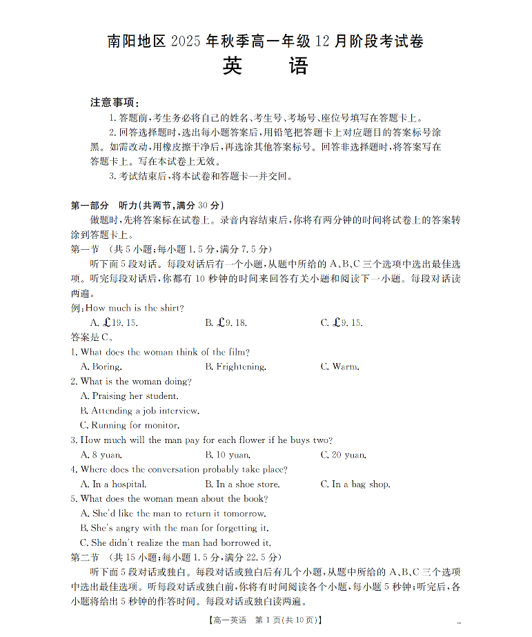 河南省南阳地区2025-2026学年高一上学期12月阶段考试卷 英语.pdf