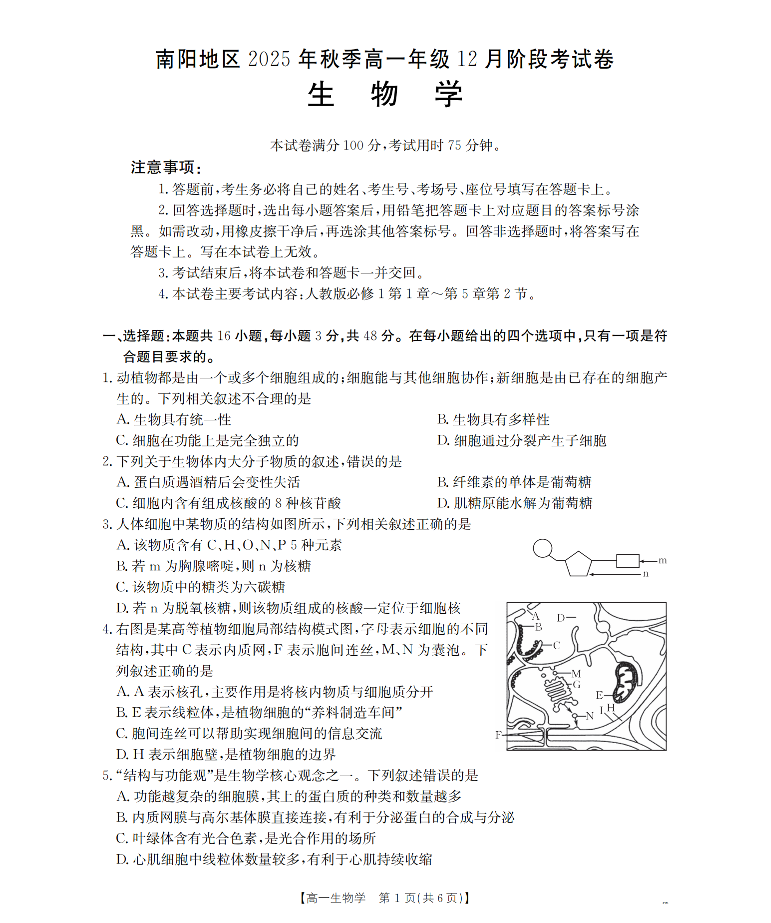 河南省南阳地区2025-2026学年高一上学期12月阶段考试卷 生物.pdf