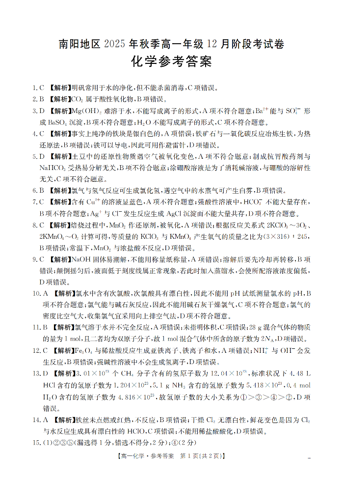河南省南阳地区2025-2026学年高一上学期12月阶段考试卷 化学答案.pdf