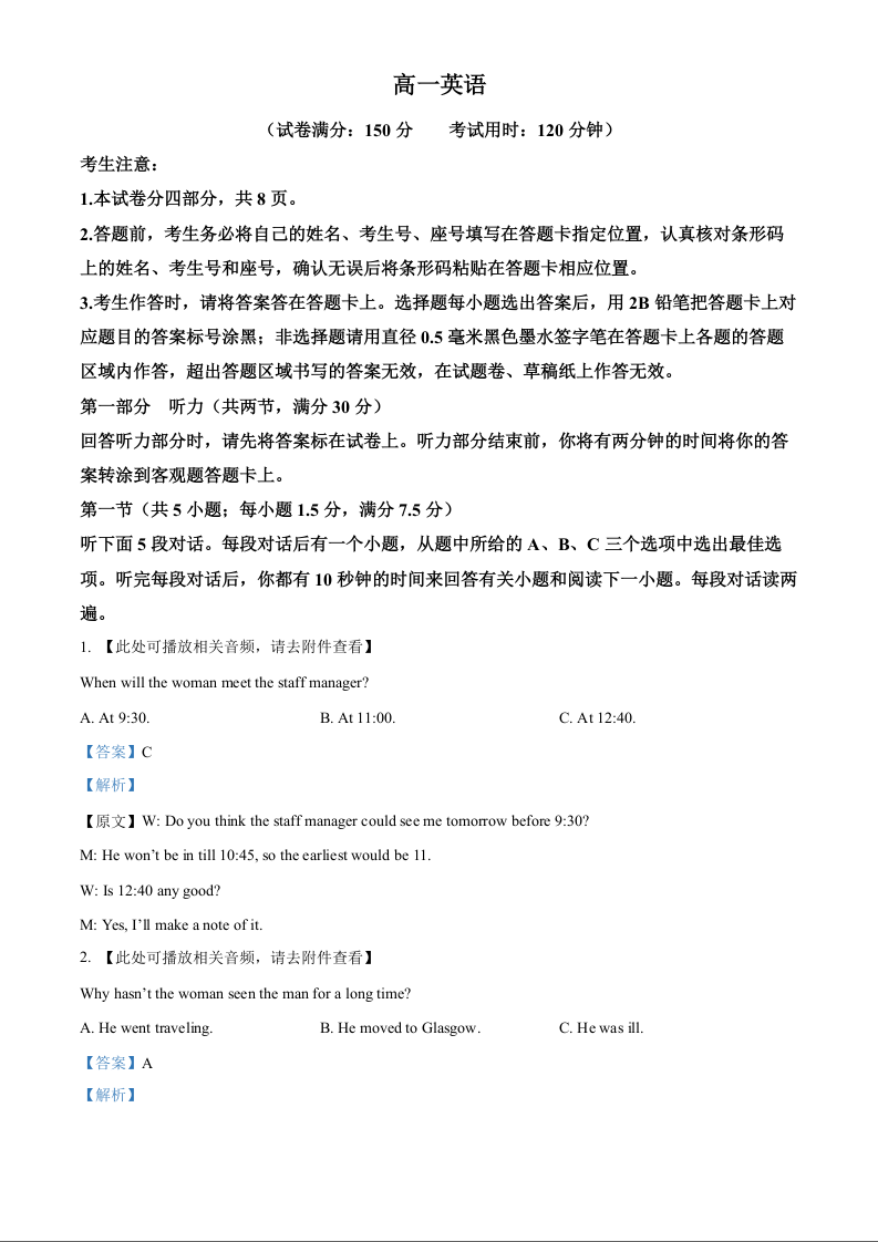 安徽省皖江名校联盟2025-2026学年高一上学期12月联考 英语答案.docx