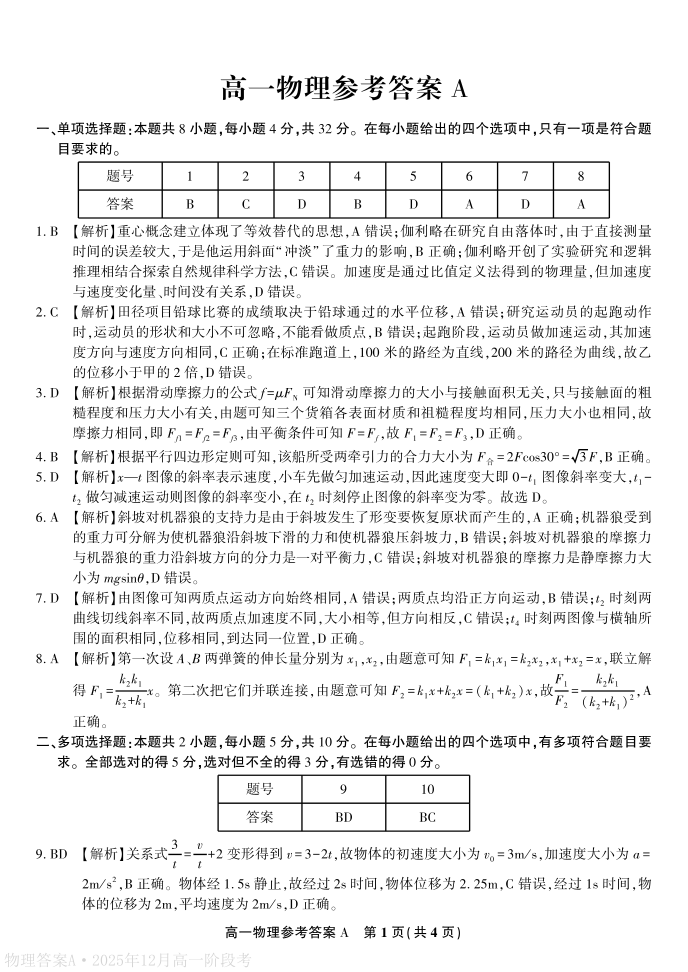 安徽省皖江名校联盟2025-2026学年高一上学期12月联考 物理答案.pdf