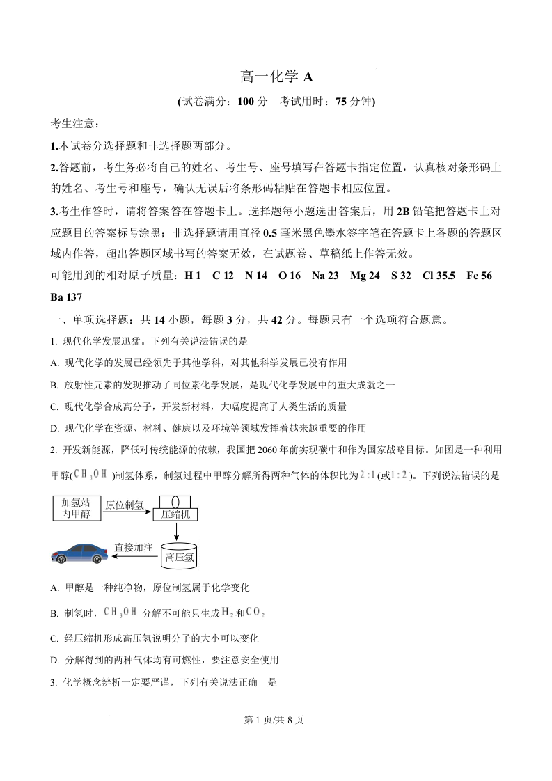 安徽省皖江名校联盟2025-2026学年高一上学期12月联考 化学.docx
