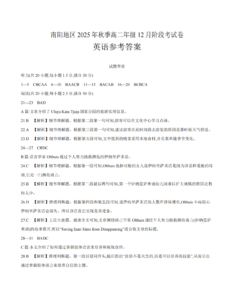 河南省南阳地区2025-2026学年高二上学期12月阶段考试卷 英语答案.pdf