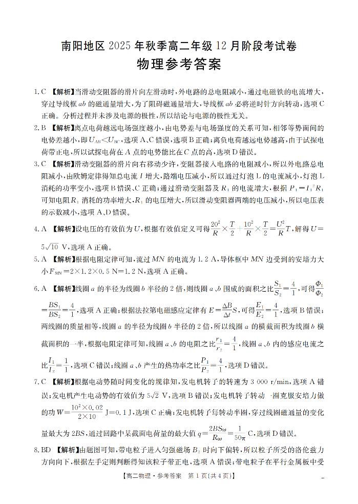 河南省南阳地区2025-2026学年高二上学期12月阶段考试卷 物理答案.pdf