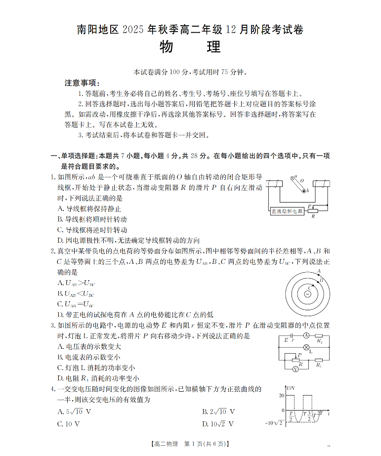 河南省南阳地区2025-2026学年高二上学期12月阶段考试卷 物理.pdf