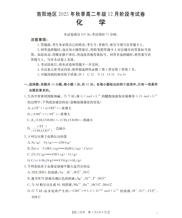 河南省南阳地区2025-2026学年高二上学期12月阶段考试卷 化学.pdf