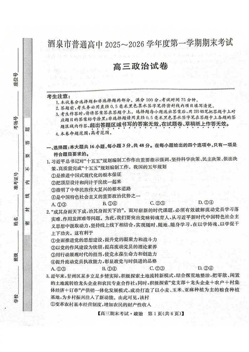 酒泉市普通高中2025~2026学年度第一学期期末考试 政治.pdf