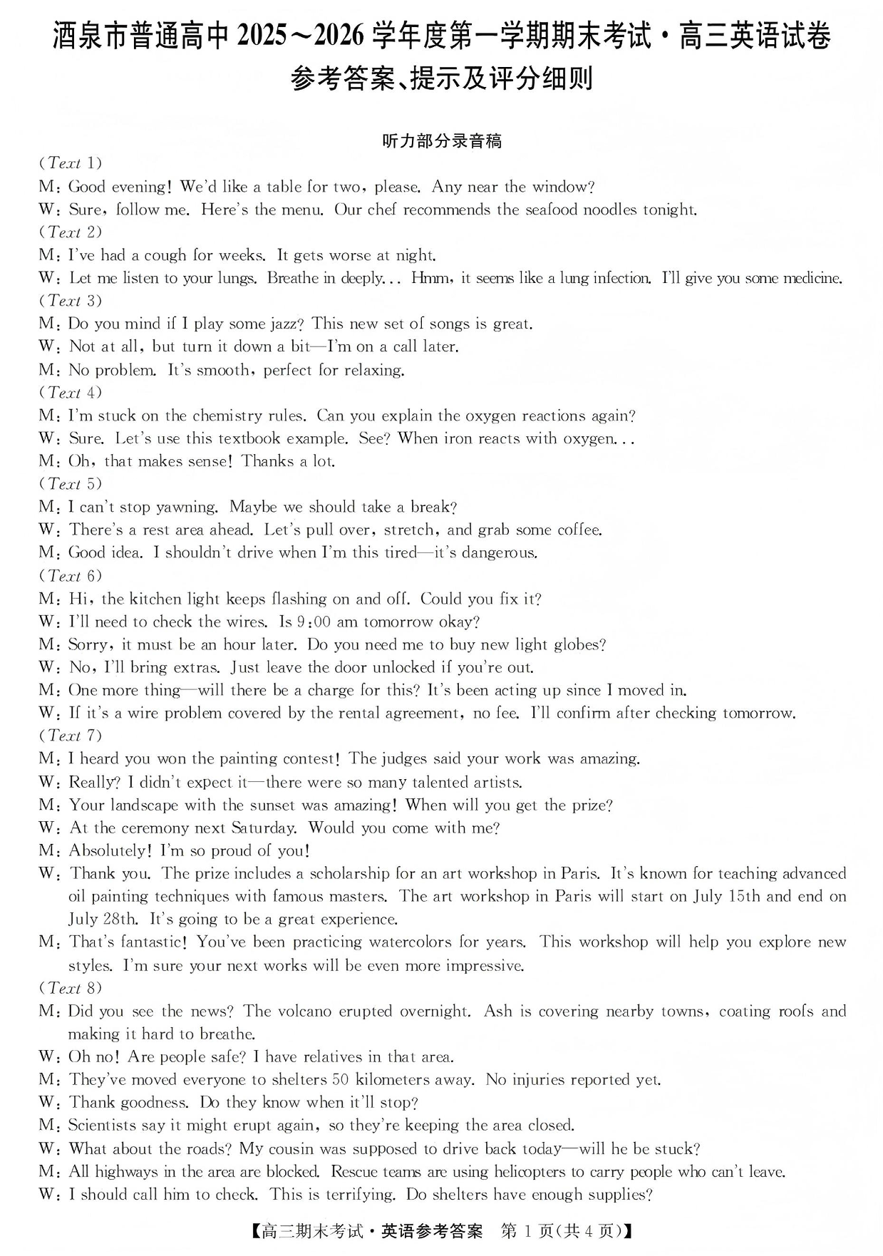 酒泉市普通高中2025~2026学年度第一学期期末考试 英语答案.pdf