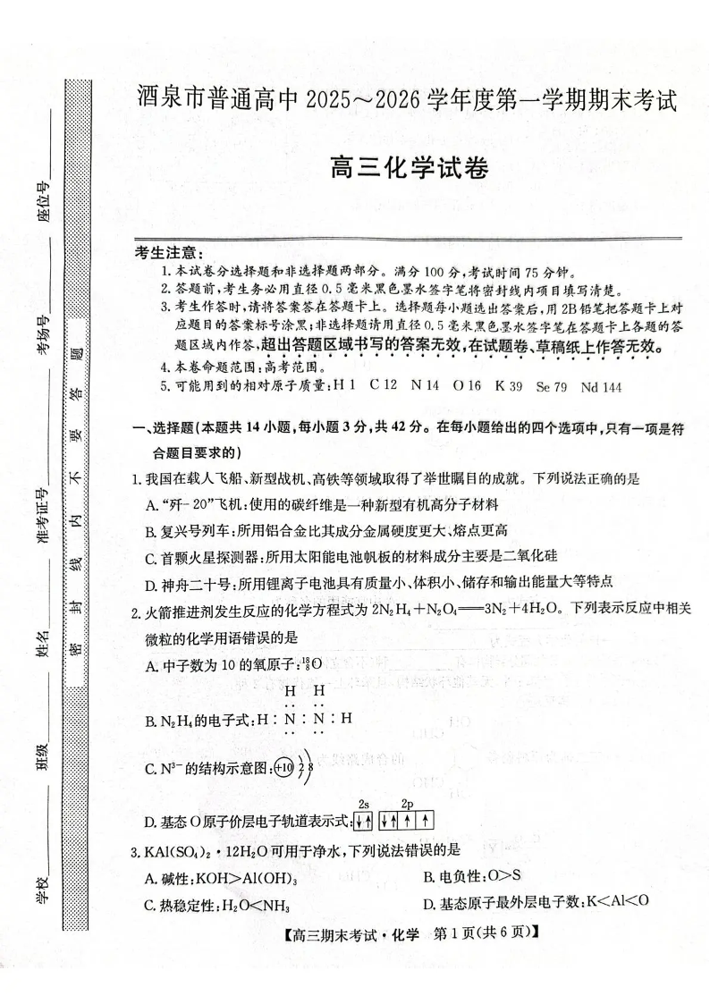酒泉市普通高中2025~2026学年度第一学期期末考试 化学.pdf
