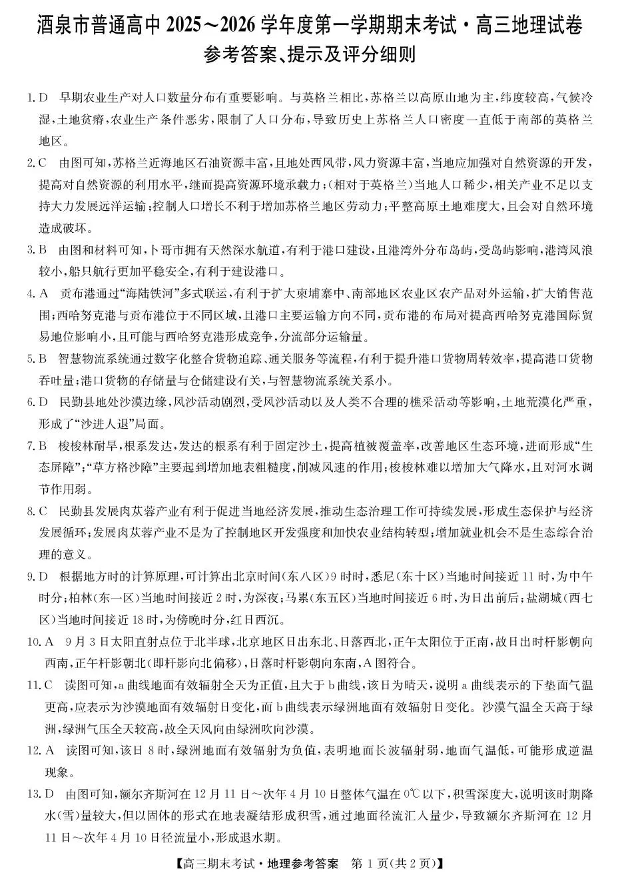 酒泉市普通高中2025~2026学年度第一学期期末考试 地理答案.pdf