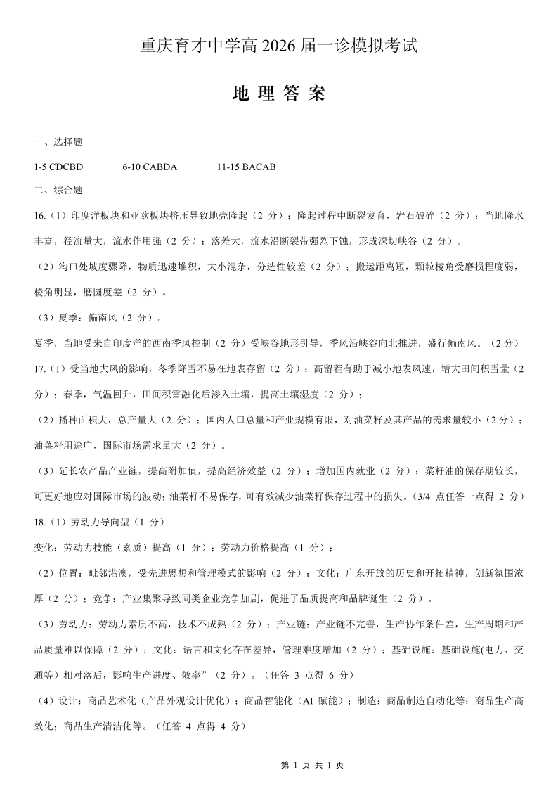 育才中学校高2026届一诊模拟考试 地理答案.pdf