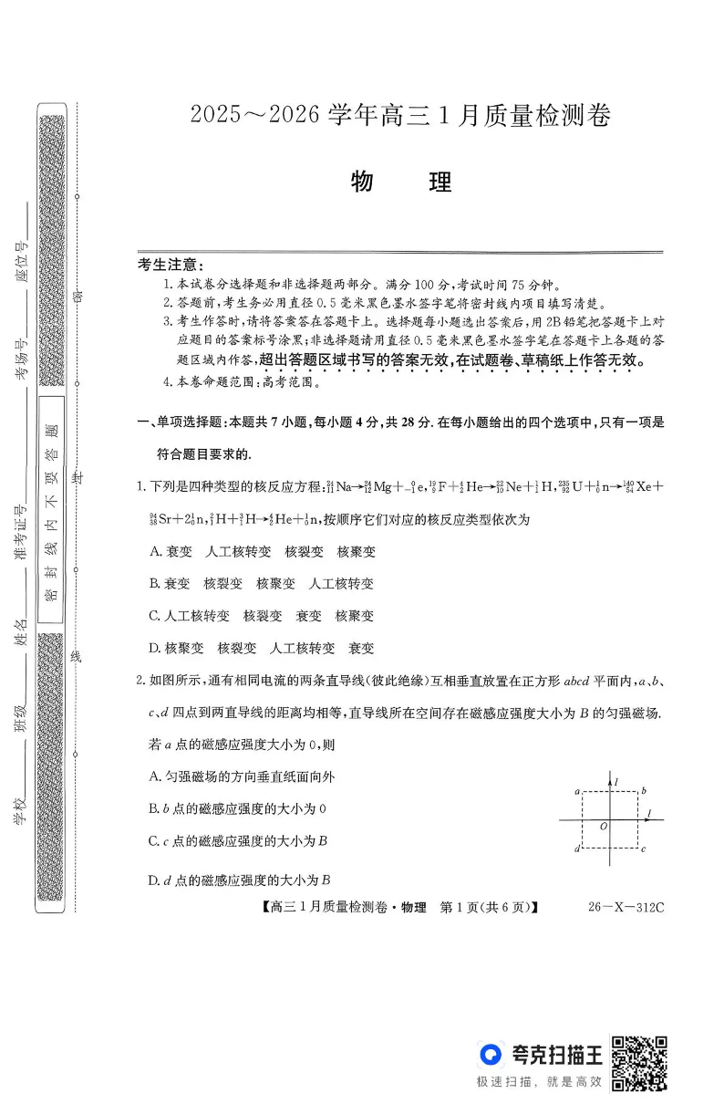 三晋卓越联盟2025~2026学年高三1月质量检测卷 物理.pdf