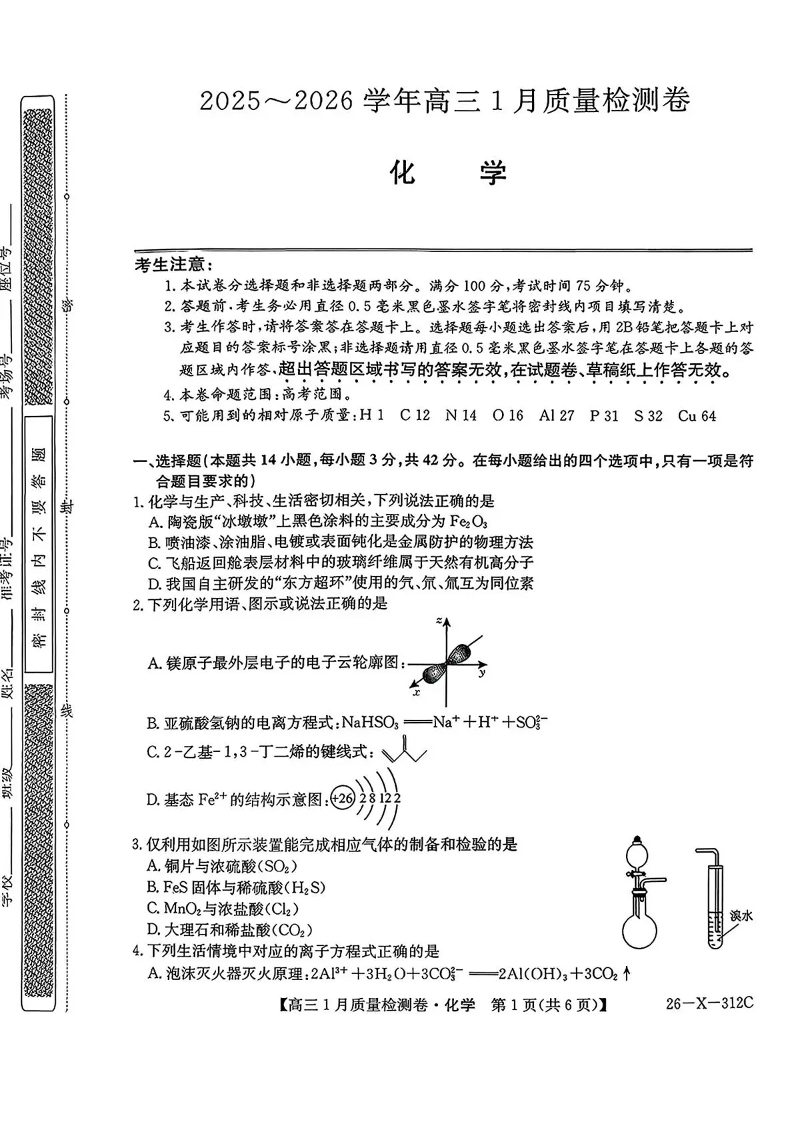 三晋卓越联盟2025~2026学年高三1月质量检测卷 化学.pdf