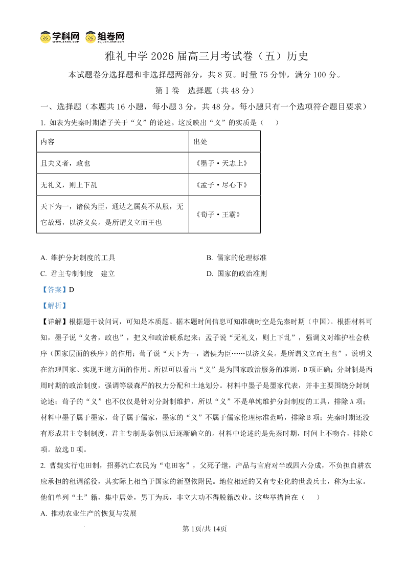 雅礼中学2026届高三月考试卷(五)历史答案.pdf