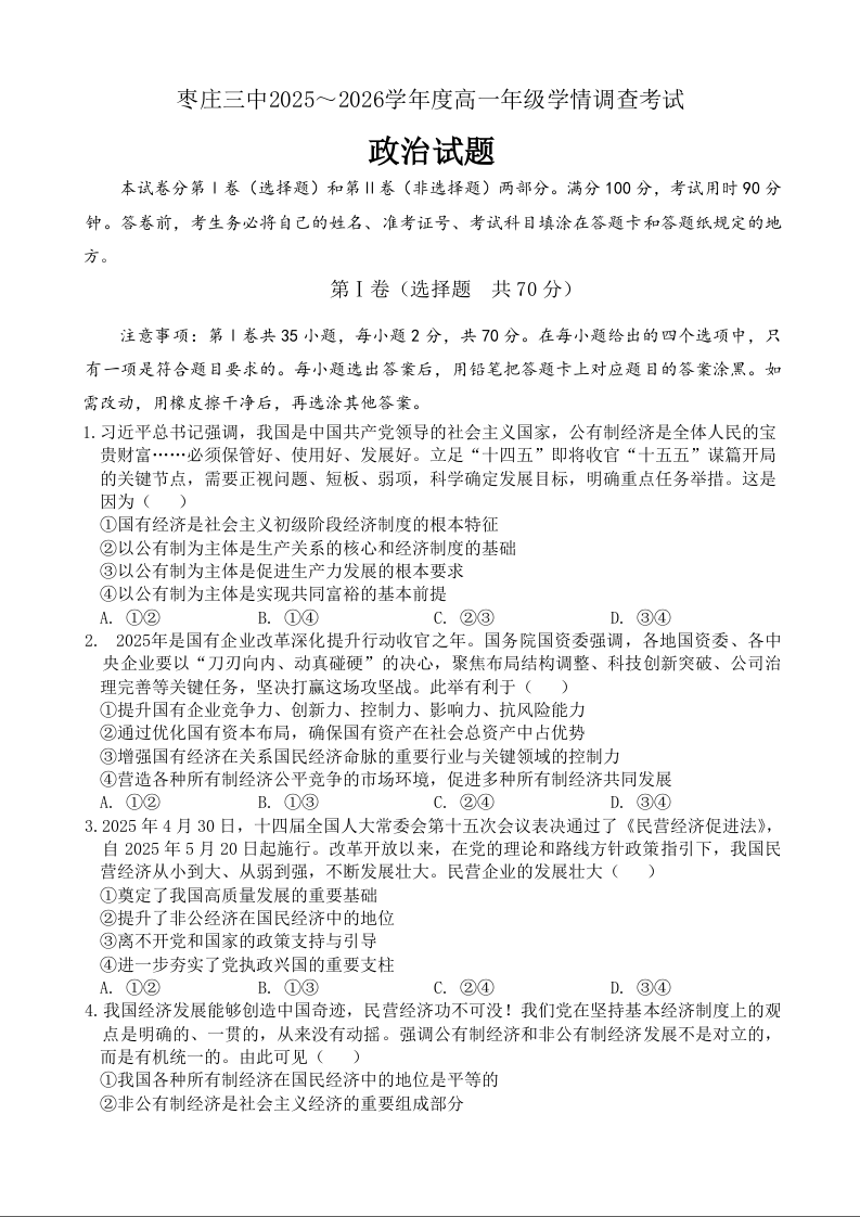 山东省枣庄市第三中学2025-2026学年高一年级学情调查考试 政治.docx