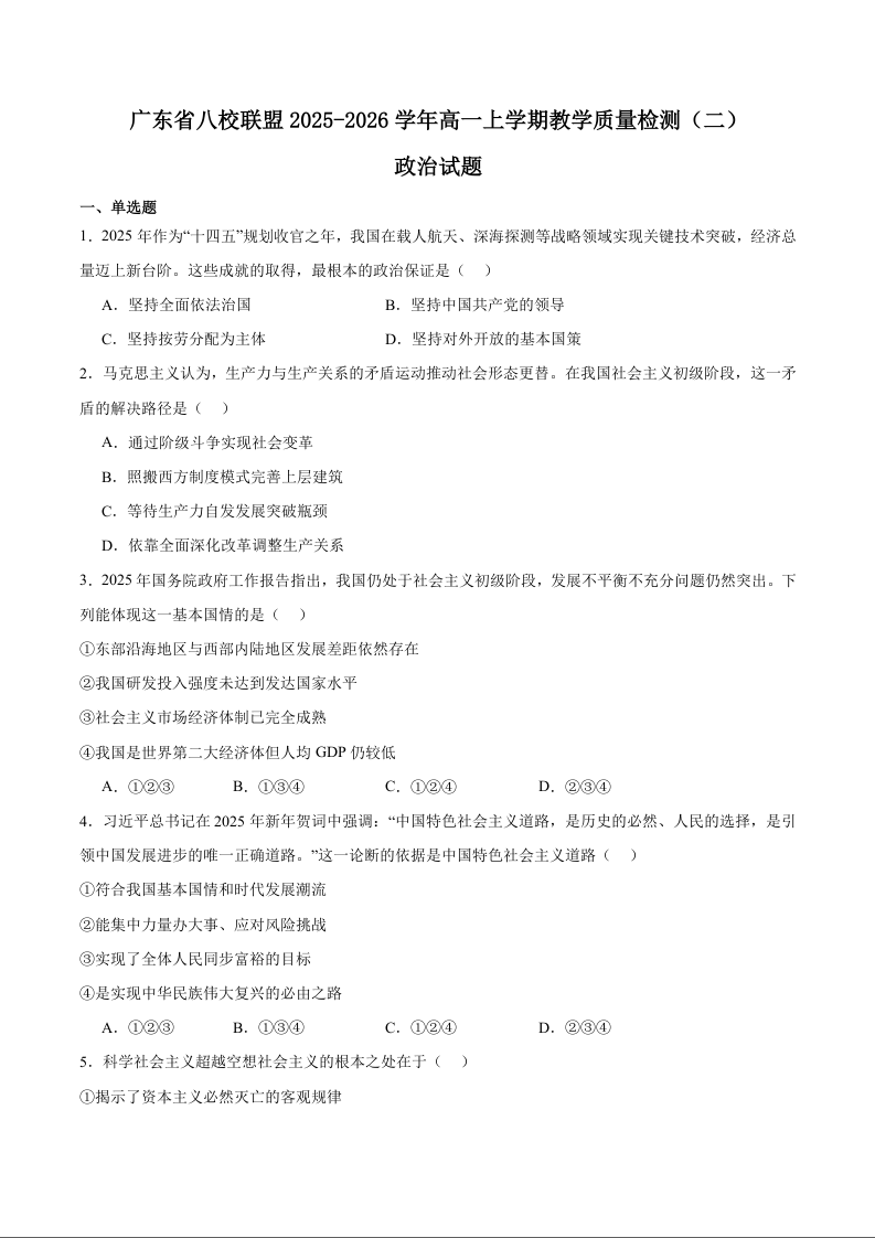 广东省八校联盟2025-2026学年高一上学期教学质量检测(二)政治试题(含答案).docx
