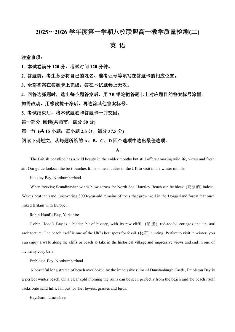 广东省八校联盟2025-2026学年高一上学期教学质量检测(二)英语试题(含答案).docx