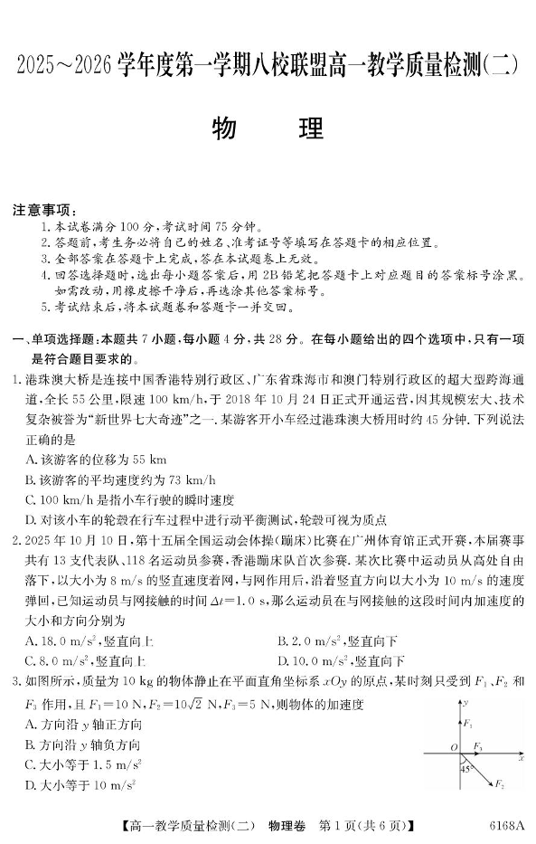 广东省八校联盟2025-2026学年高一上学期教学质量检测(二)物理试题(含答案).pdf