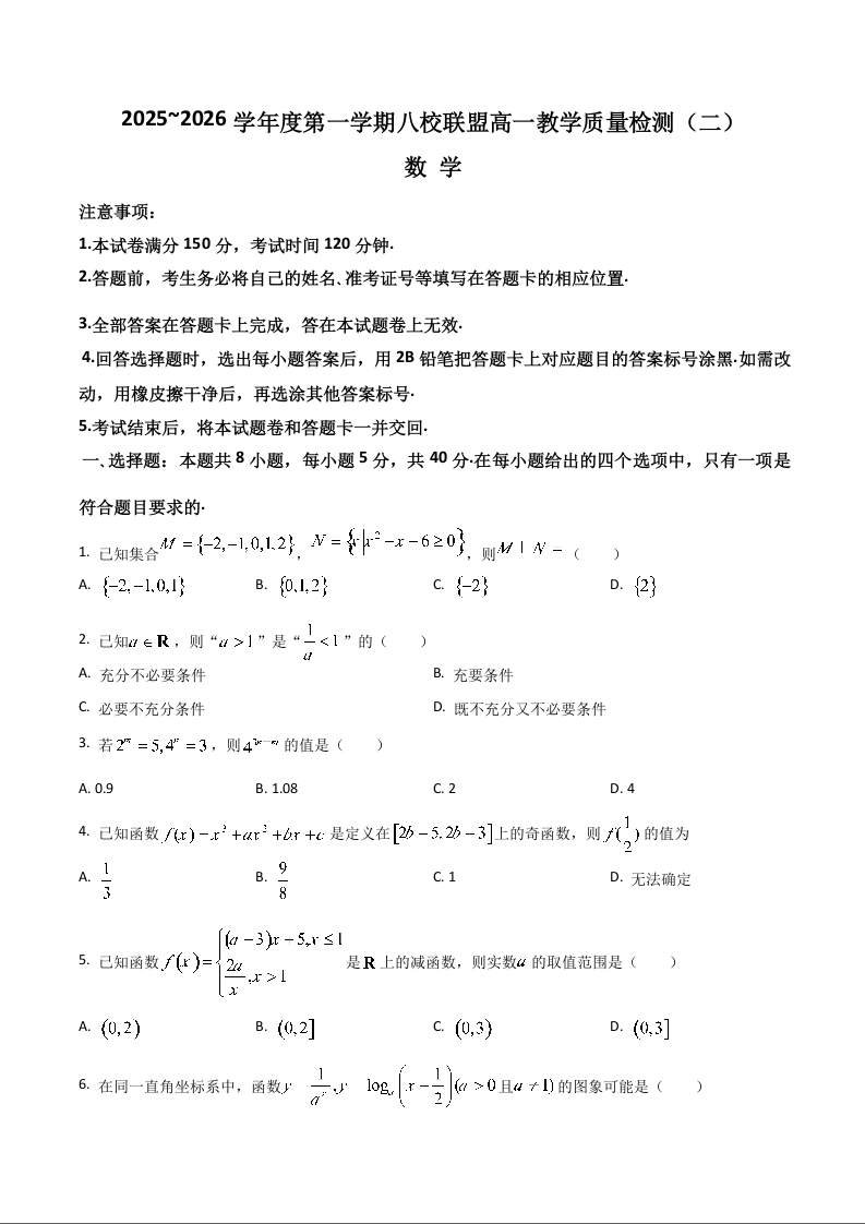 广东省八校联盟2025-2026学年高一上学期教学质量检测(二)数学试题(含答案).docx