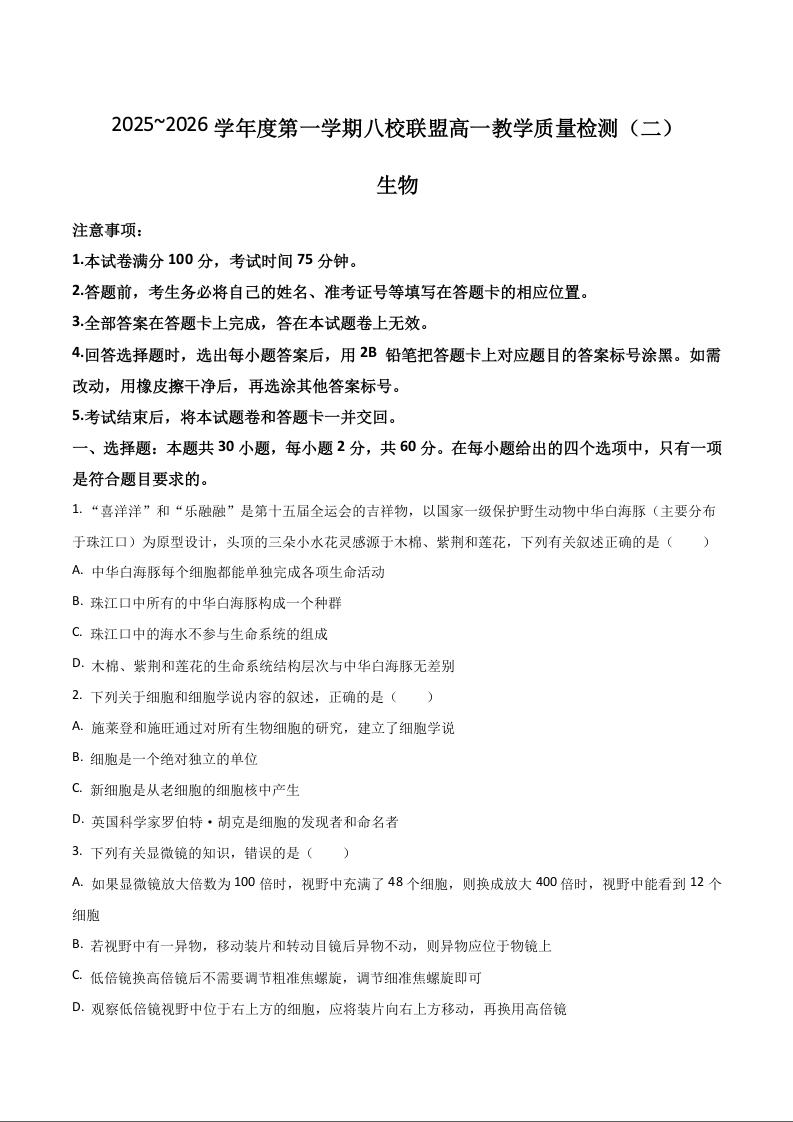 广东省八校联盟2025-2026学年高一上学期教学质量检测(二)生物试题(含答案).docx