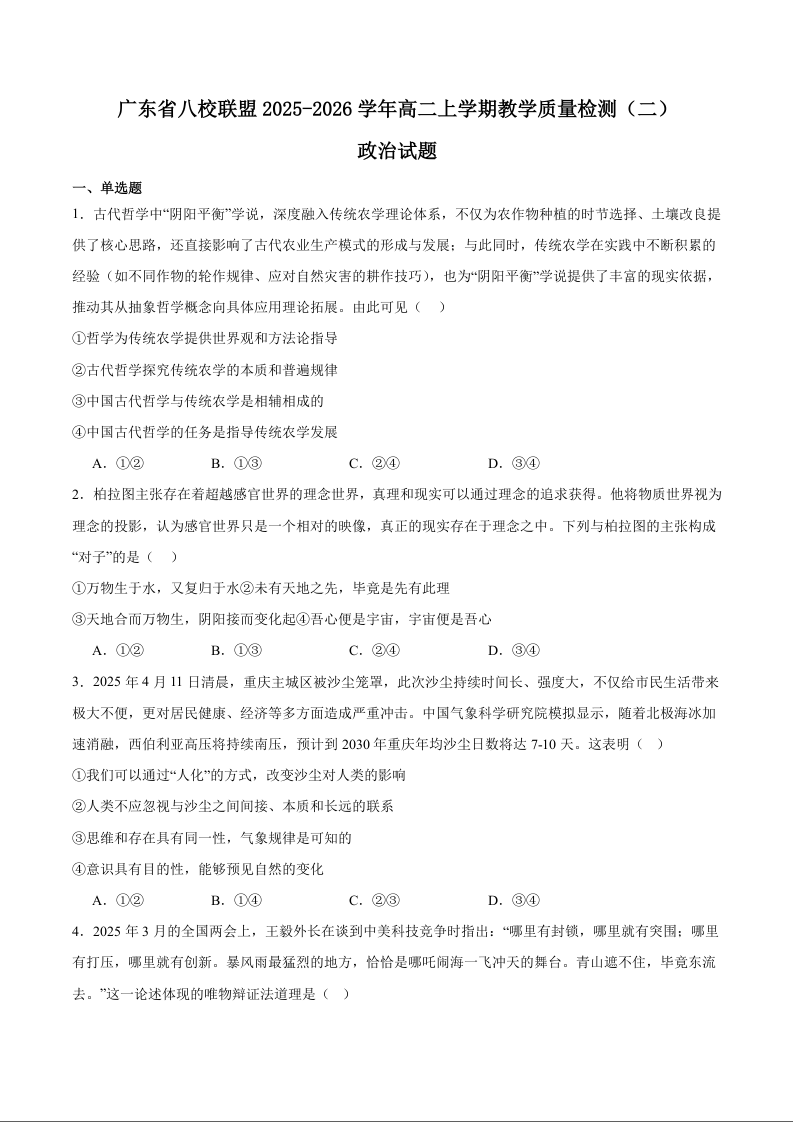 广东省八校联盟2025-2026学年高二上学期教学质量检测(二)政治试题(含答案).docx