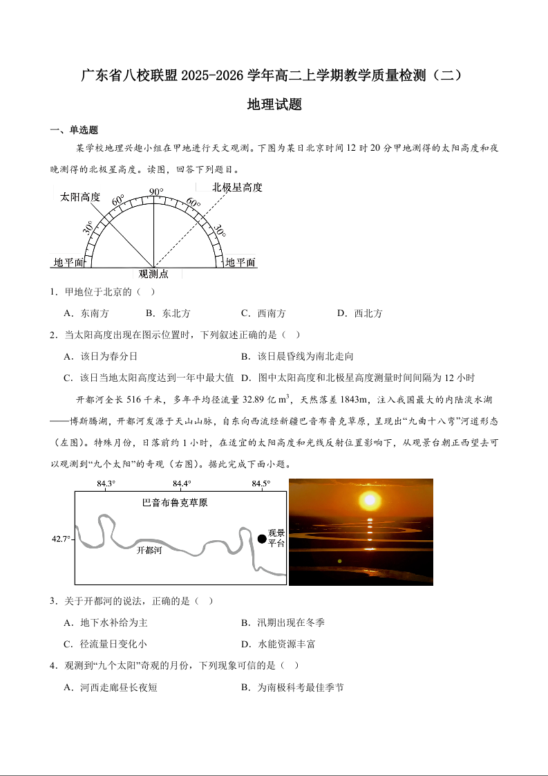 广东省八校联盟2025-2026学年高二上学期教学质量检测(二)地理试题(含答案).docx
