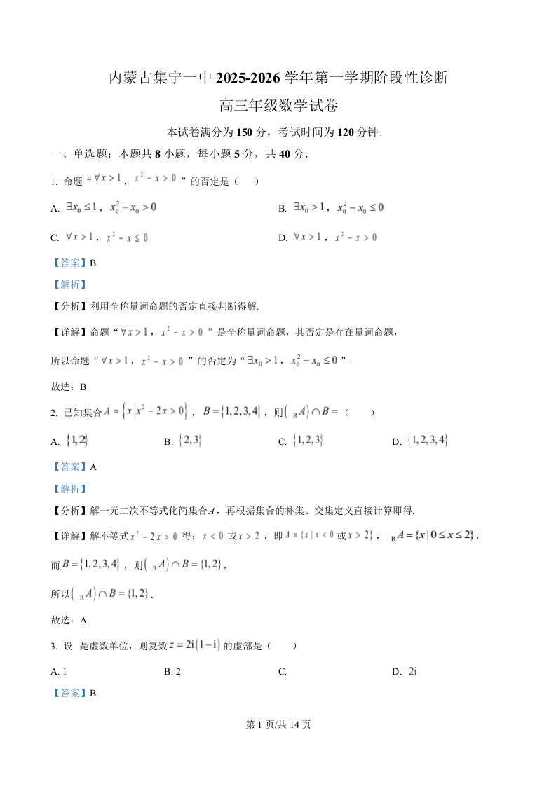 内蒙古集宁一中2025—2026学年第一学期高三年级阶段性诊断 数学答案.docx