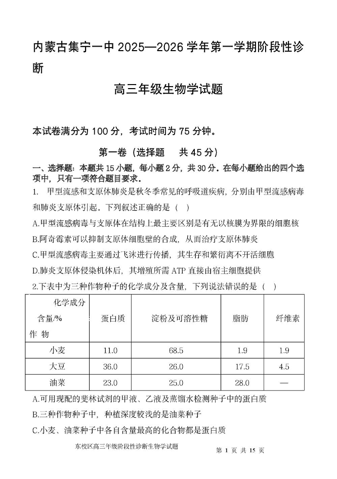 内蒙古集宁一中2025—2026学年第一学期高三年级阶段性诊断 生物.pdf