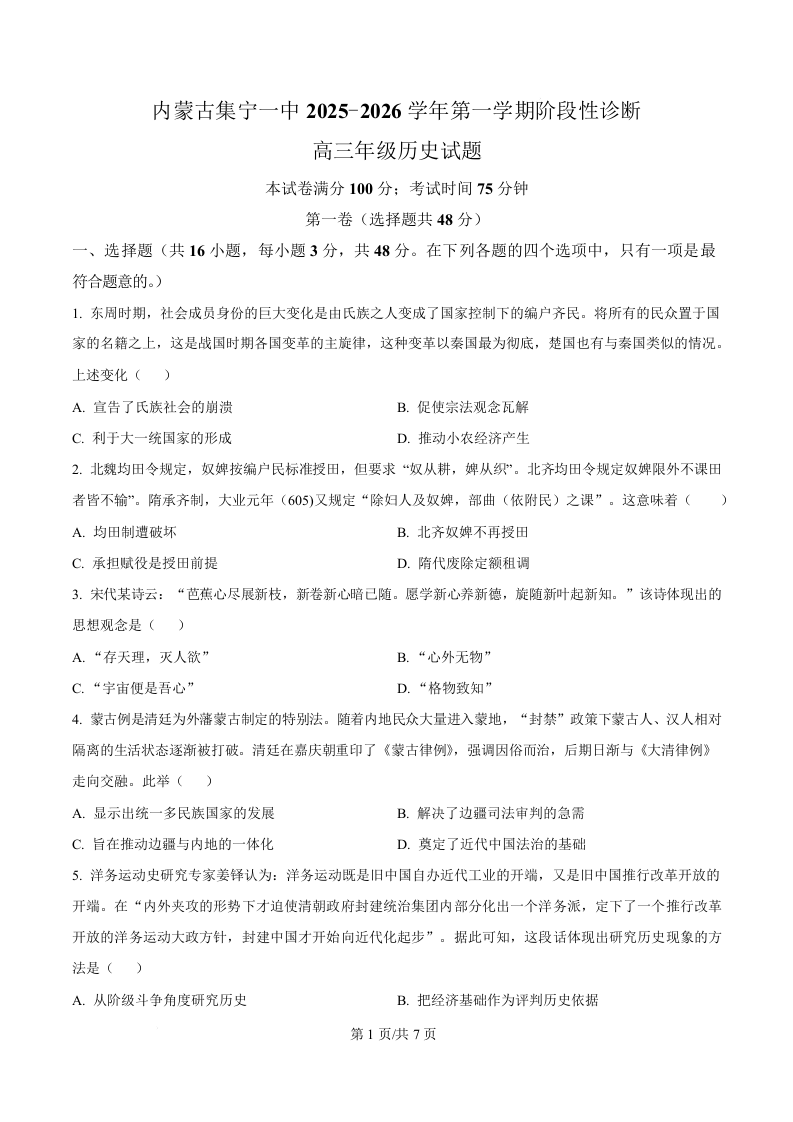 内蒙古集宁一中2025—2026学年第一学期高三年级阶段性诊断 历史.docx