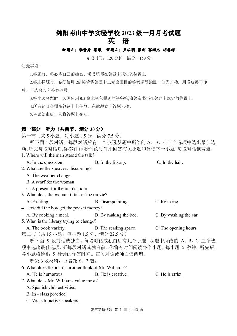 绵阳南山中学实验学校2025-2026学年高三上学期1月月考 英语试题(含答案).pdf