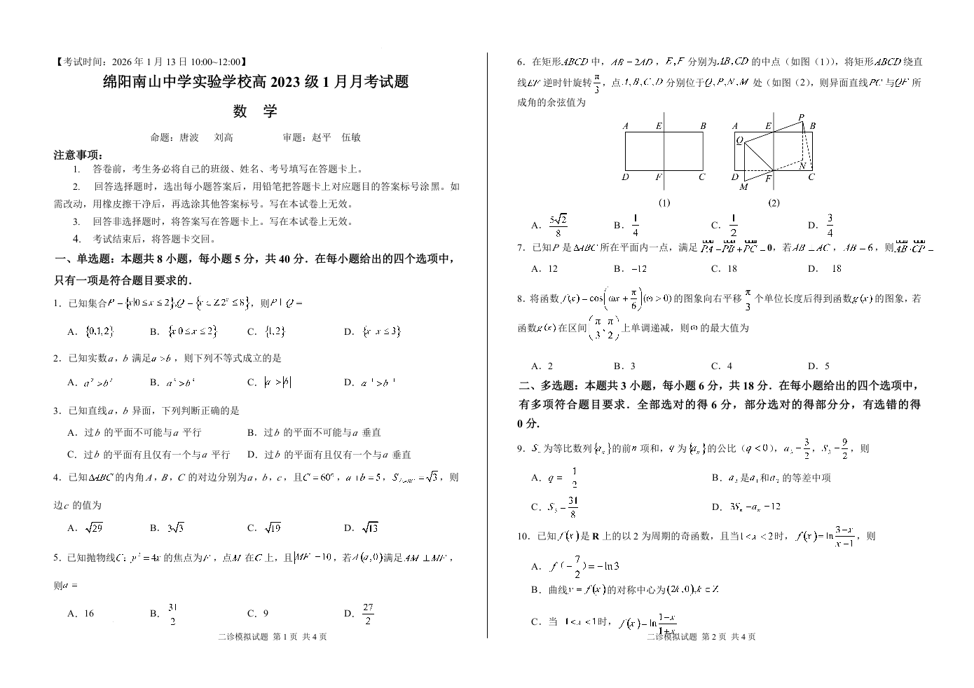 绵阳南山中学实验学校2025-2026学年高三上学期1月月考 数学试题(含答案).docx