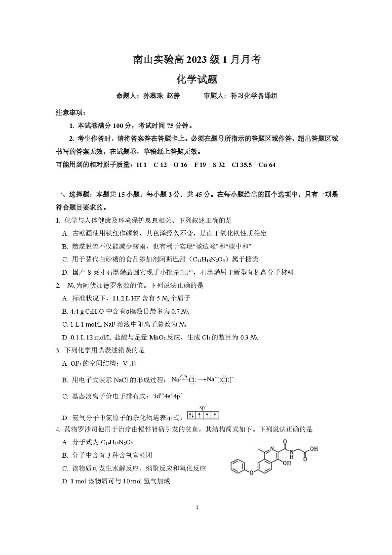 绵阳南山中学实验学校2025-2026学年高三上学期1月月考 化学试题(含答案).pdf