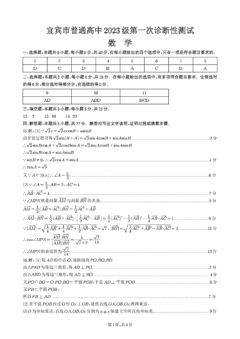 宜宾市普通高中2023级第一次诊断性测试 数学答案.pdf