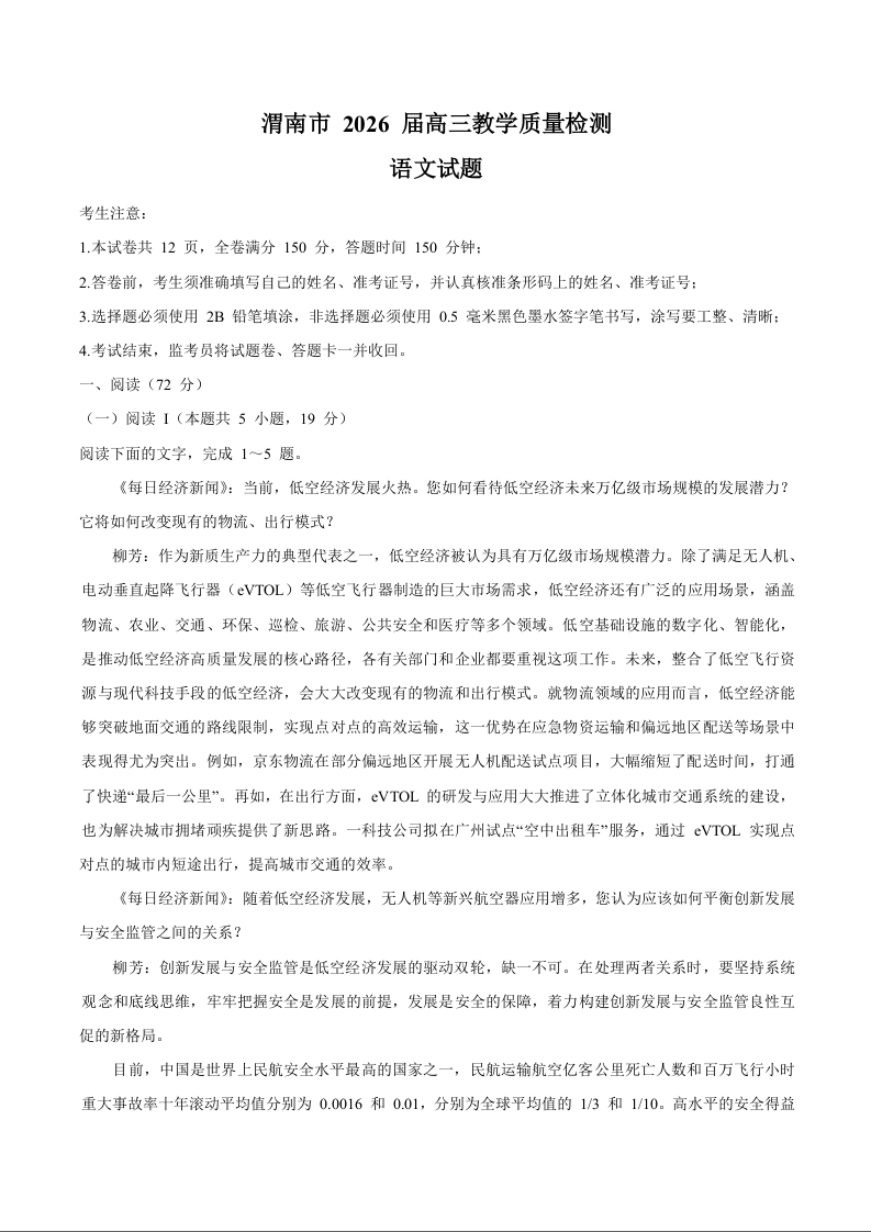 陕西省渭南市2026届高三上学期教学质量检测(Ⅰ)语文试题(含答案).docx