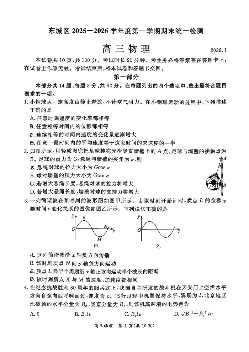 北京市东城区2025-2026学年第一学期高三年级期末统一检测 物理试题(含答案).pdf